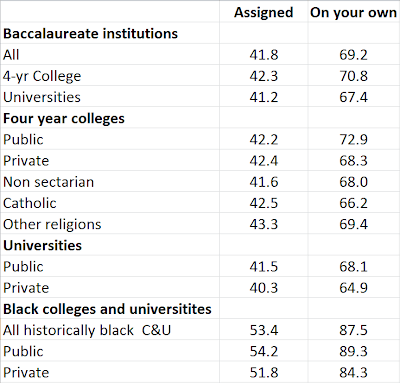 Digging a bit deeper, we see that students entering public schools were a little more likely to have online experience than those entering private schools. (Public colleges and universities also offer more online instruction). To me, the most interesting finding was that students entering historically black colleges and universities are much more likely to have online education experience -- on their own or assigned -- than the typical incoming freshman. I could speculate on the cause of this discrepancy, but it really requires further research.